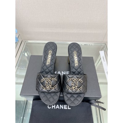 CHANEL 23Ss new diamond check chain double C buckle metal heel slippers sheepskin lining