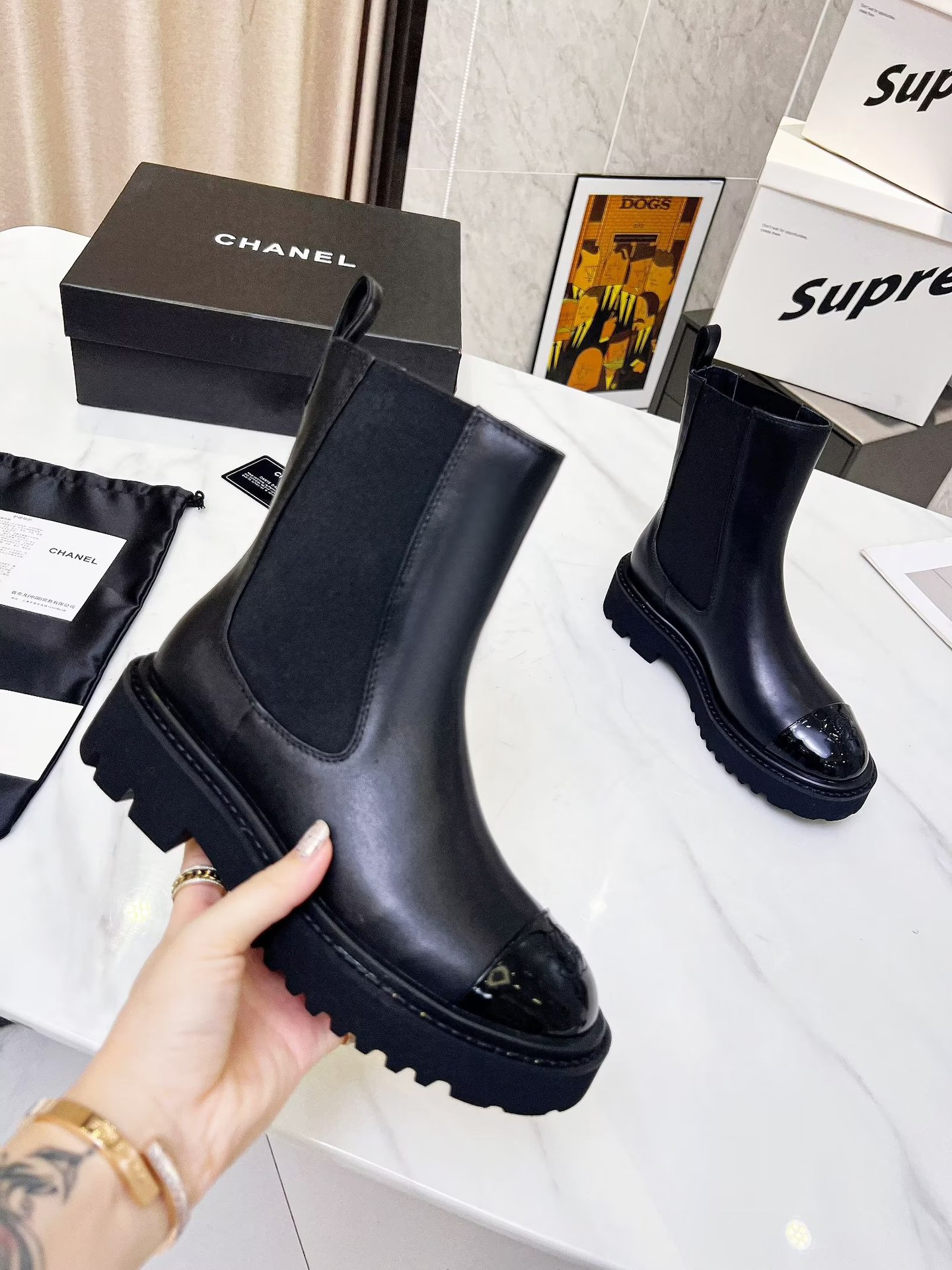 CHANEL puts on his boots with one foot